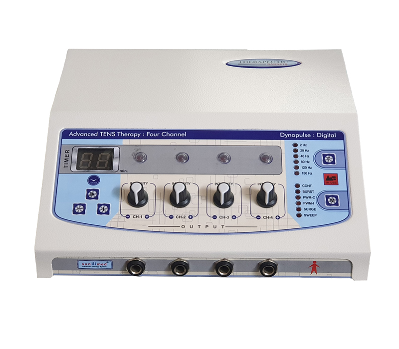 Premium 4-channel TENS device with 6 therapy modes, intuitive interface, and 8-electrode capacity—built for high-performance clinical electrotherapy.